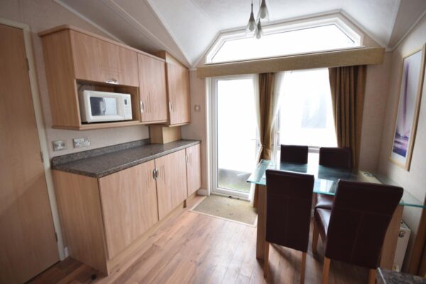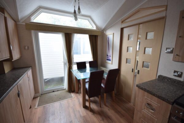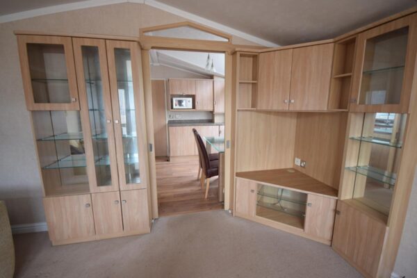 The living space is a lovely room which is separatable from the kitchen and dining room by sliding doors. It comes fully furnished with all you (there is an extra recliner in there but doesn’t fit the room so we’ll be removing it!) It also has lots of storage, from cupboards to sideboards, TV unit and an electric fireplace, plus front opening French doors.