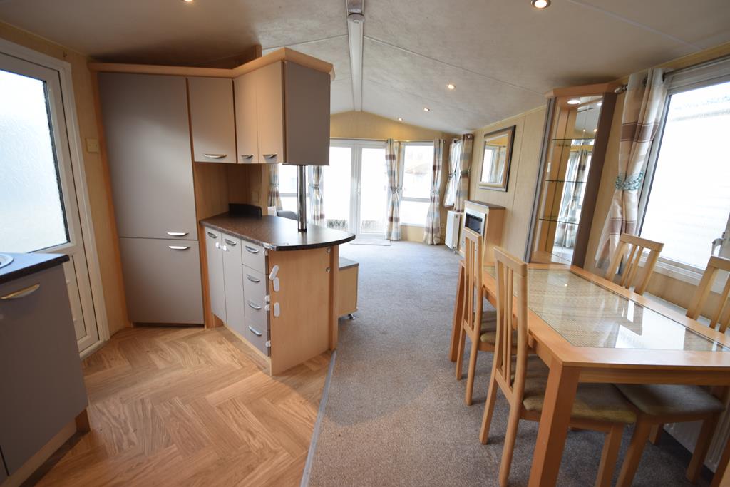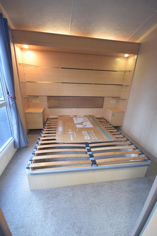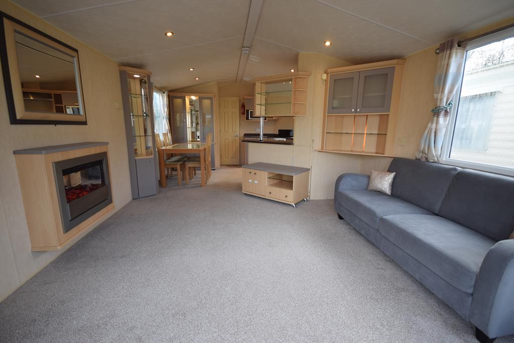 Step through the front French doors into an enormously spacious living area, plenty of space for your own furniture in here and includes the freestanding sofa pictured. This model is bursting with storage! Lots of sideboards and units with lights, plus a feature fireplace with powerful electric heating.