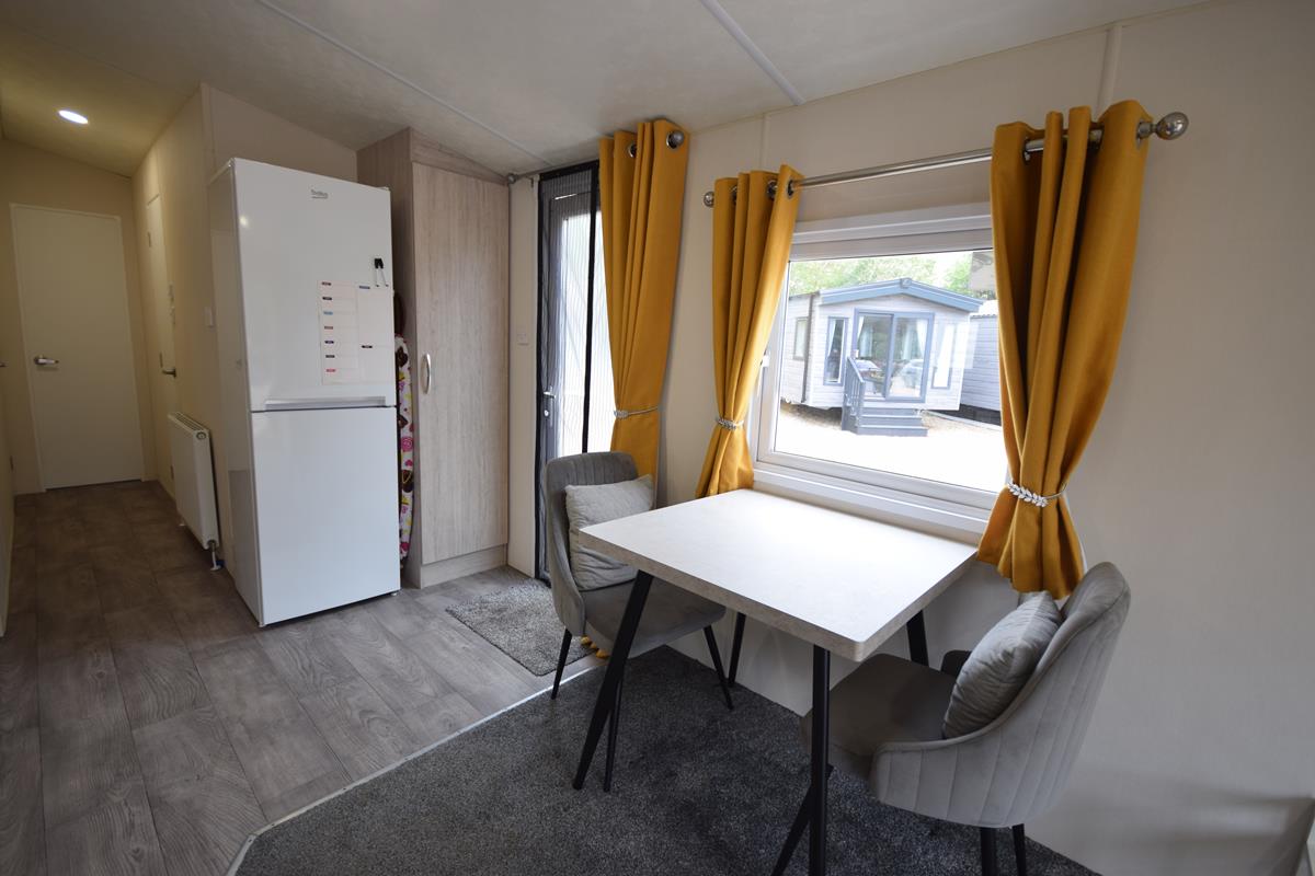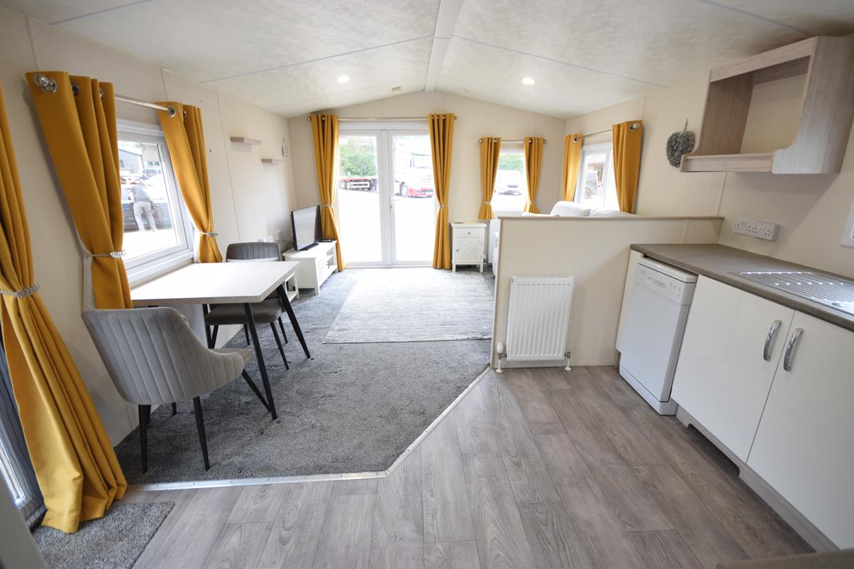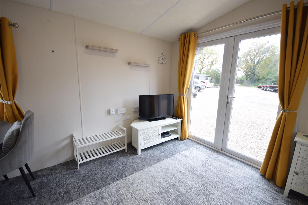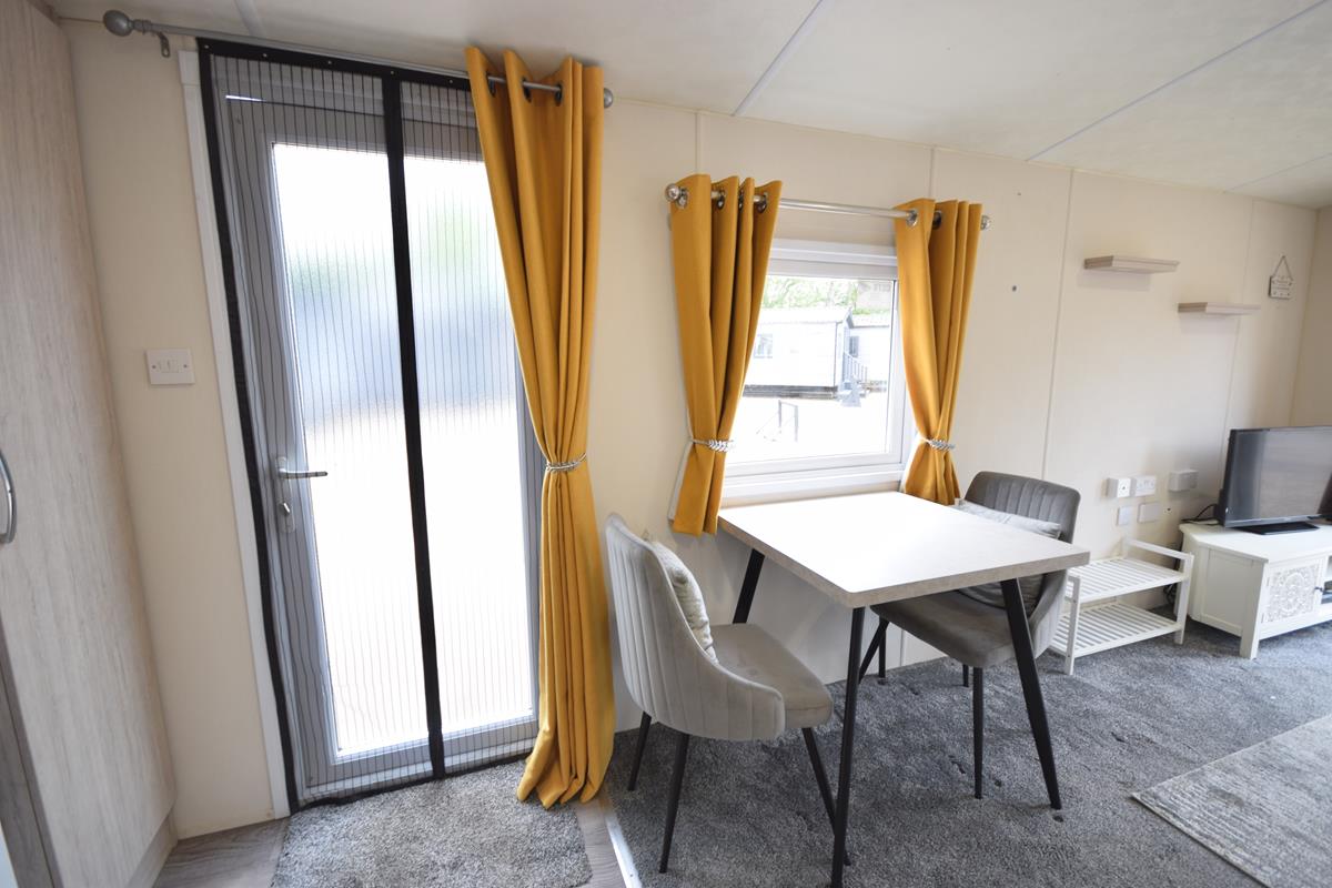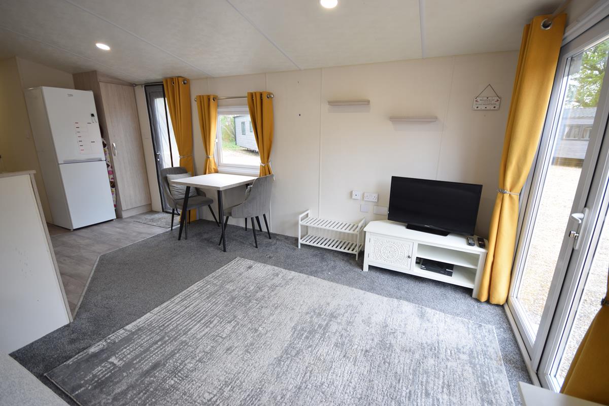 The living space is a very good size with freestanding sofa and coffee tables/ storage and TV unit. Also included are the dining table and chairs.