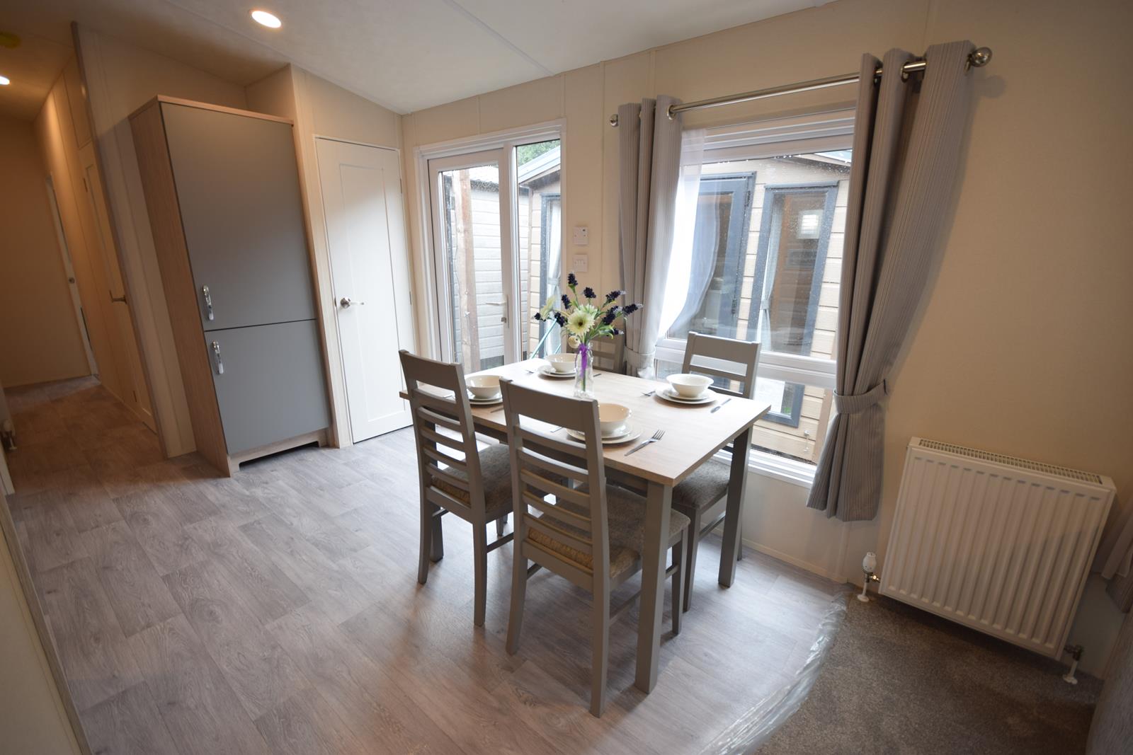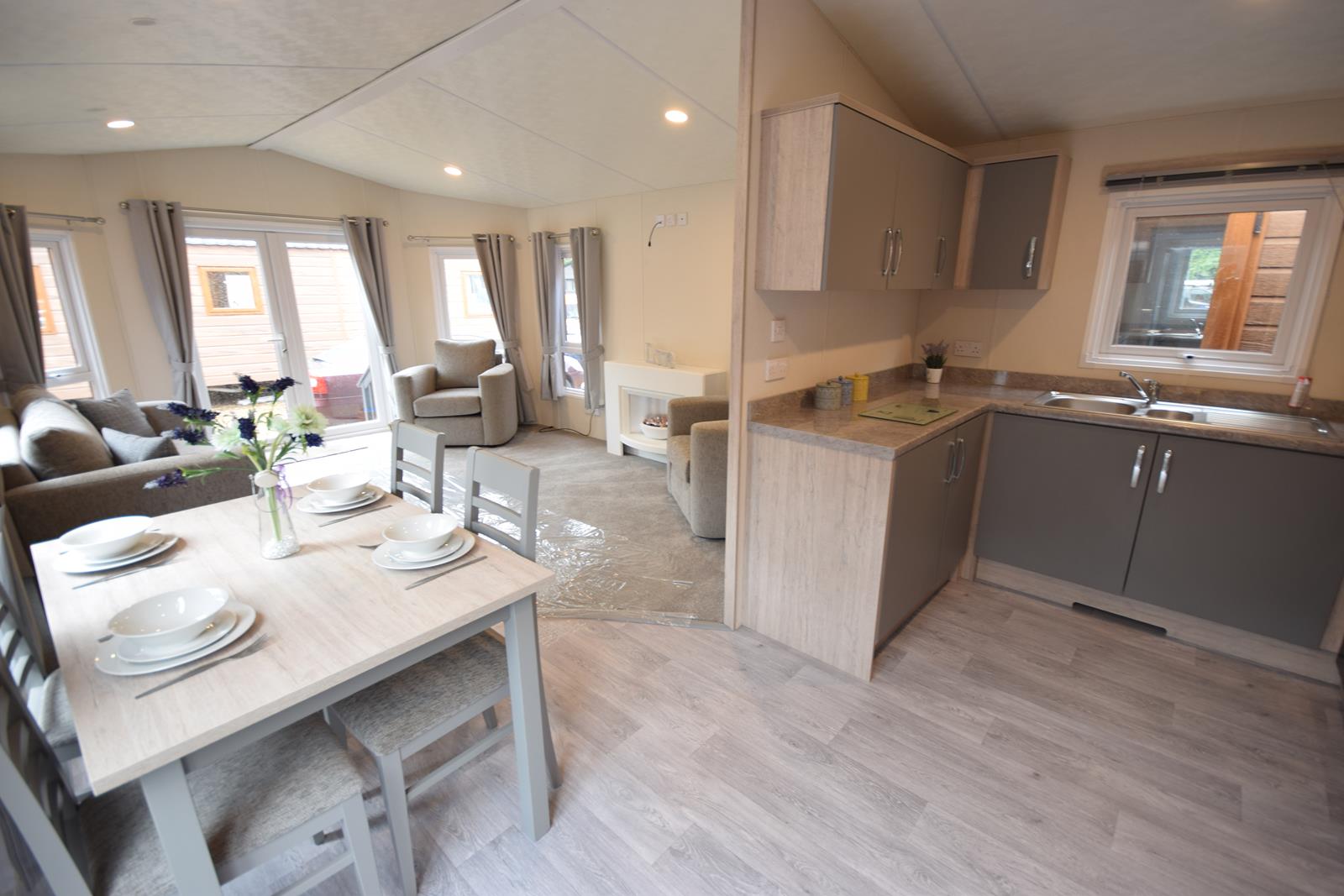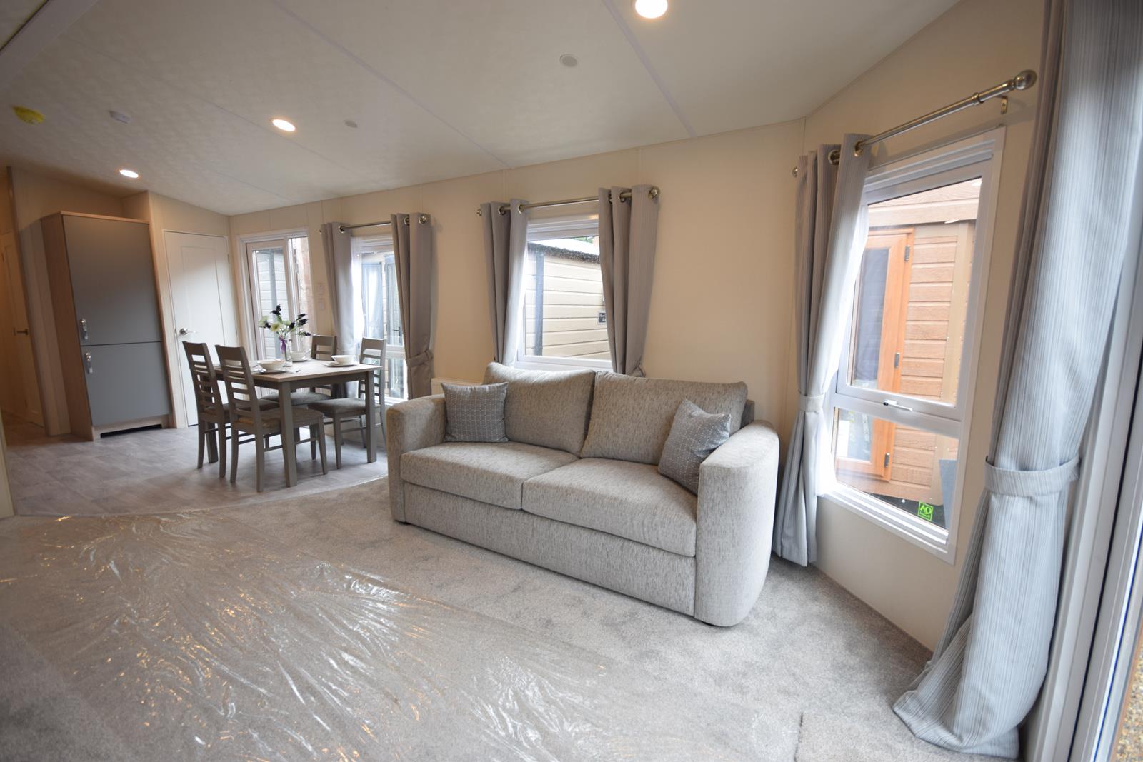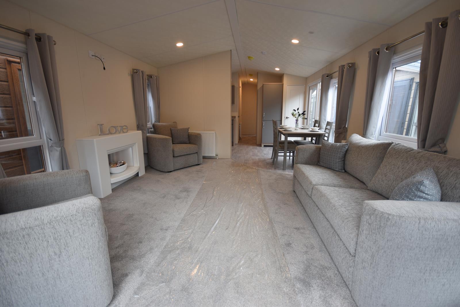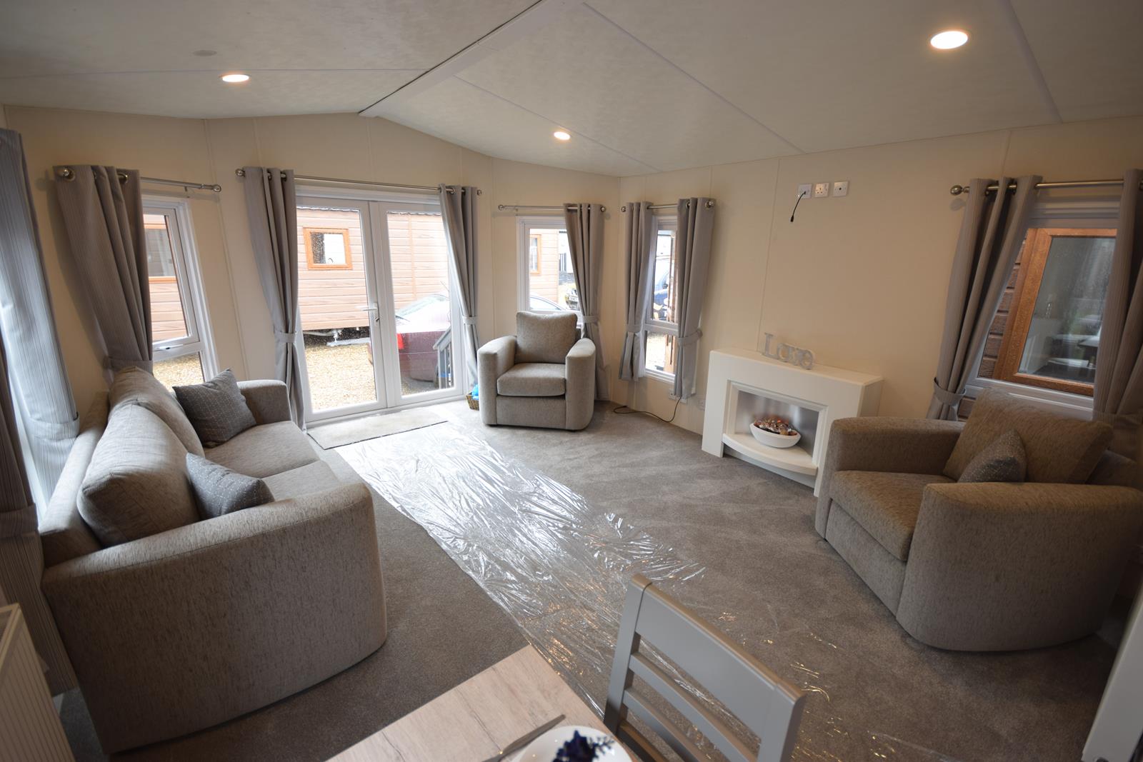 The model on show is our newest addition to the range; The Sunrise Lodge Deluxe Super, a generous size at 40ft x 13ft (internal measurement) with 2 or 3 beds. The 2 bed version as pictured, comes fully fitted with everything you need, from the living room furniture, to kitchen and appliances, bathrooms, en-suite and beds. We can also provide it unfurnished if you wish.