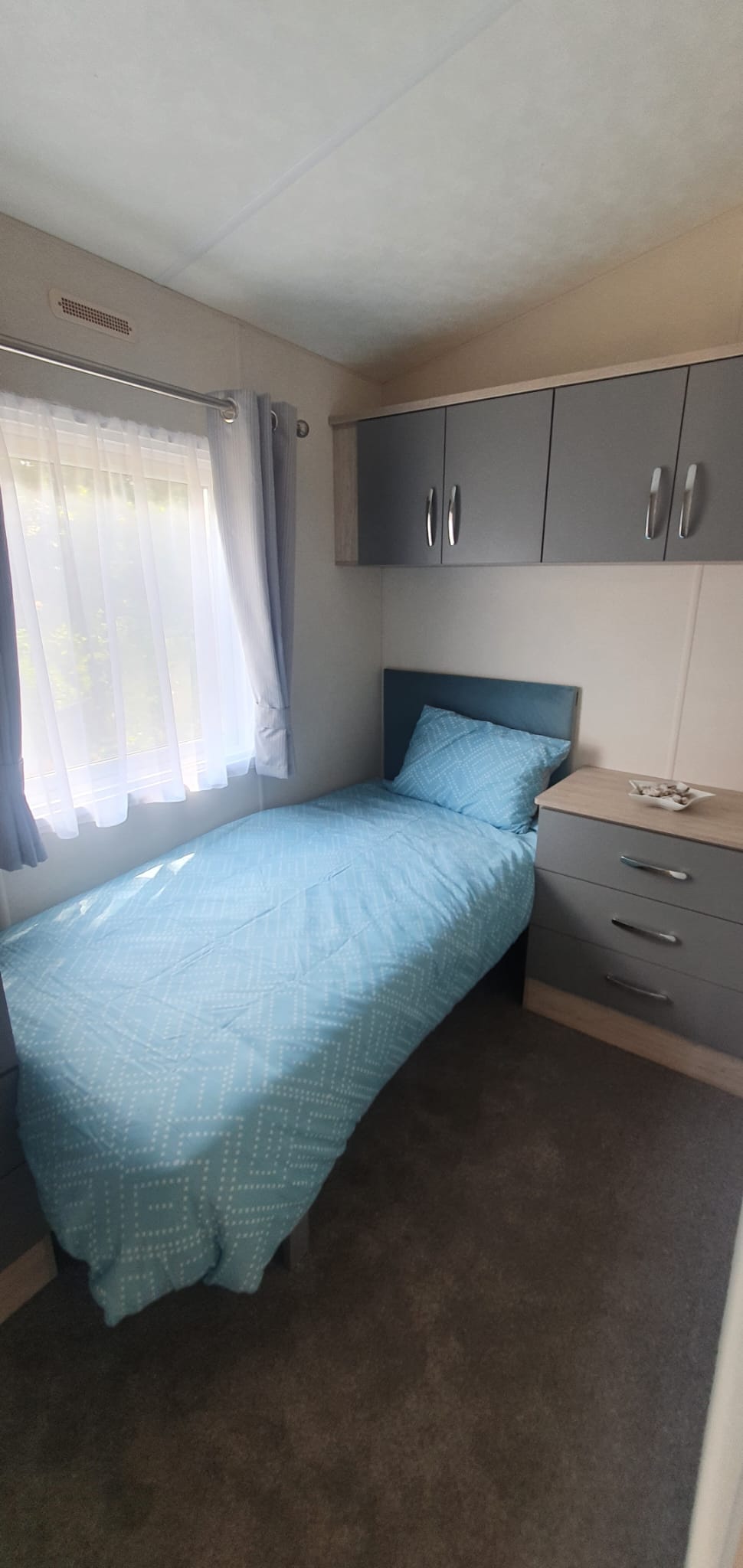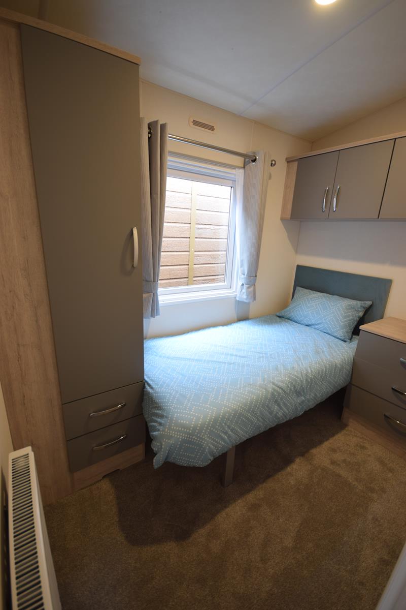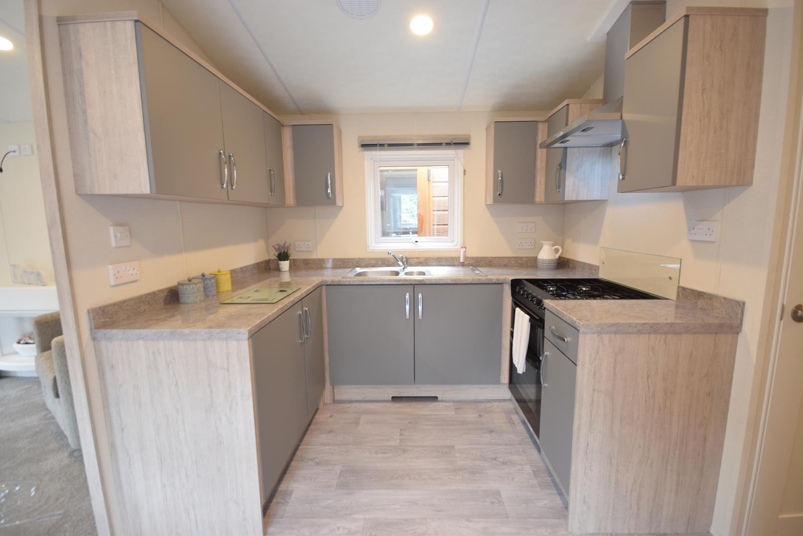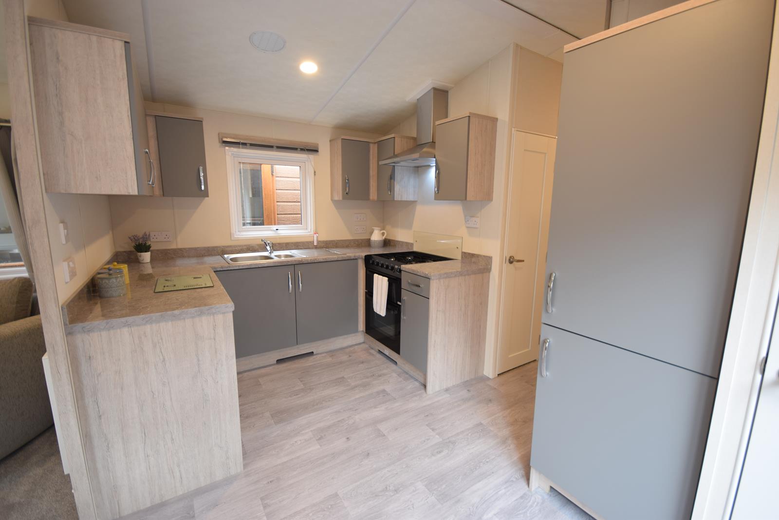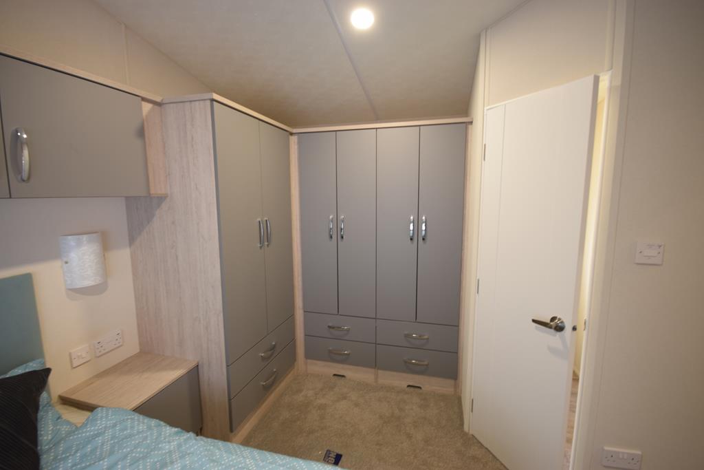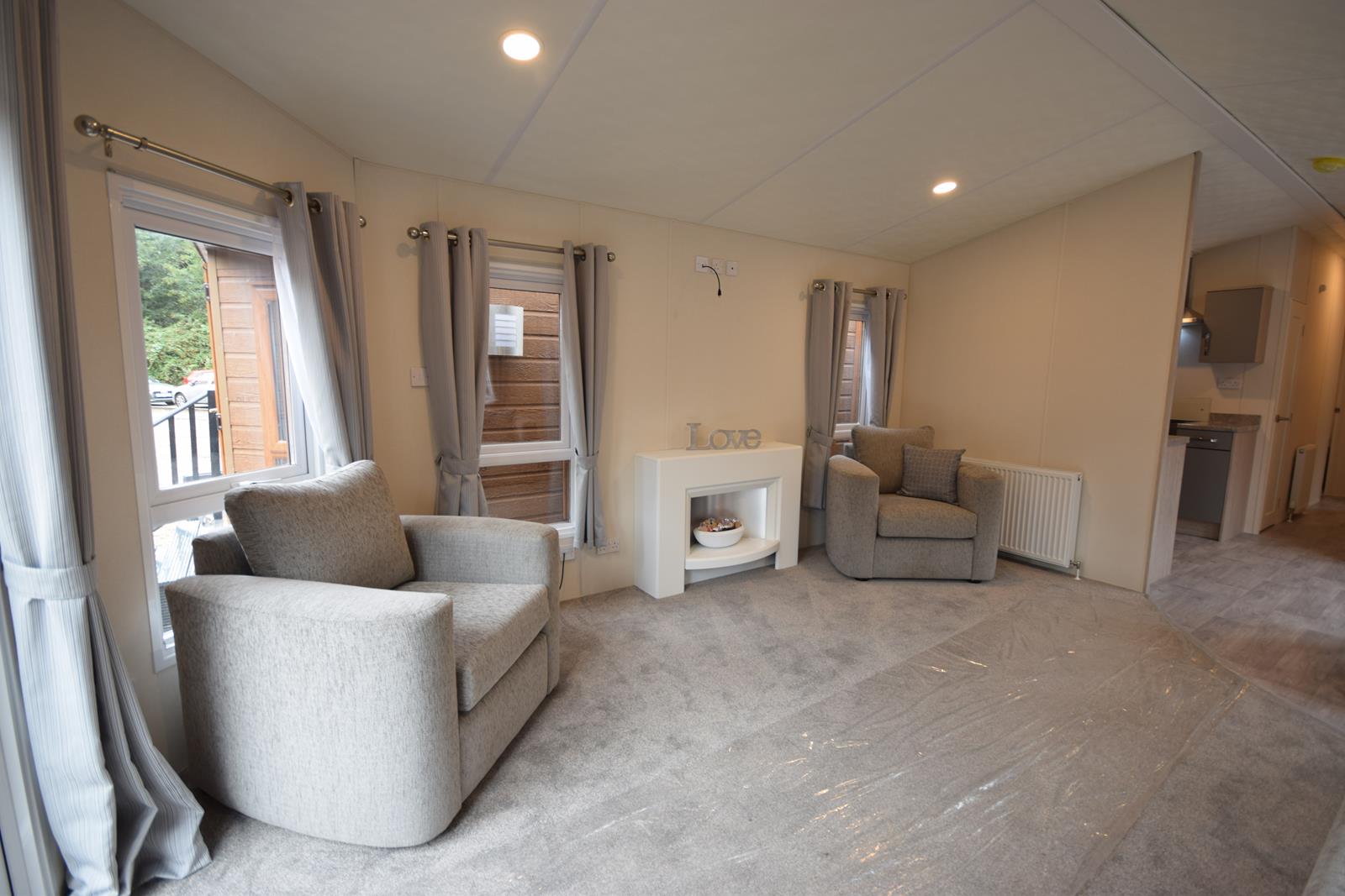The model on show is our newest addition to the range; The Sunrise Lodge Deluxe Super, a generous size at 40ft x 13ft (internal measurement) with 2 or 3 beds. The 2 bed version as pictured, comes fully fitted with everything you need, from the living room furniture, to kitchen and appliances, bathrooms, en-suite and beds. We can also provide it unfurnished if you wish.