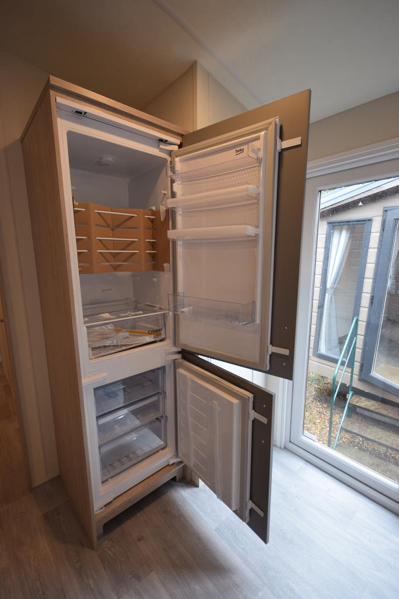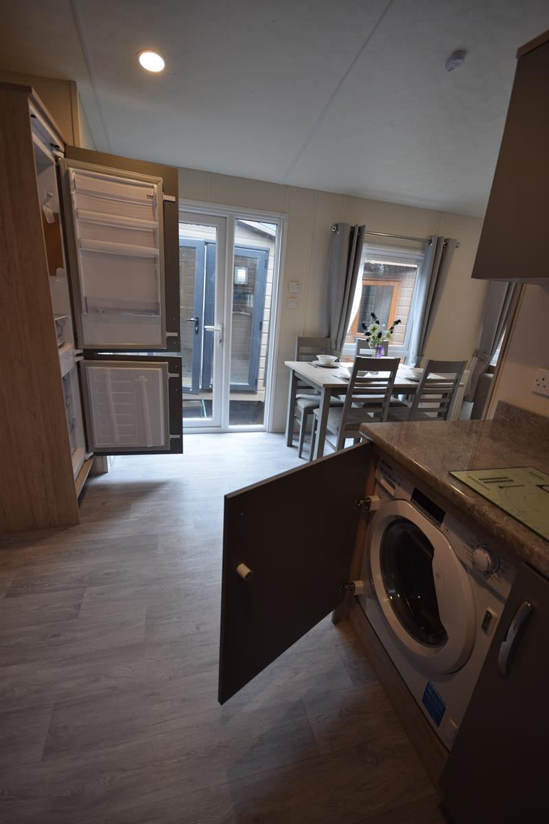 The kitchen is very impressive with lots of workspace and cupboards, low level spotlights, integrated large fridge freezer, washer/ dryer and oven & hob with extractor fan. All wood throughout from here is finished in stunning Italian Molina and cream gloss. You can choose to have just Molina without the gloss if you prefer, it’s pictured on one of our other models.